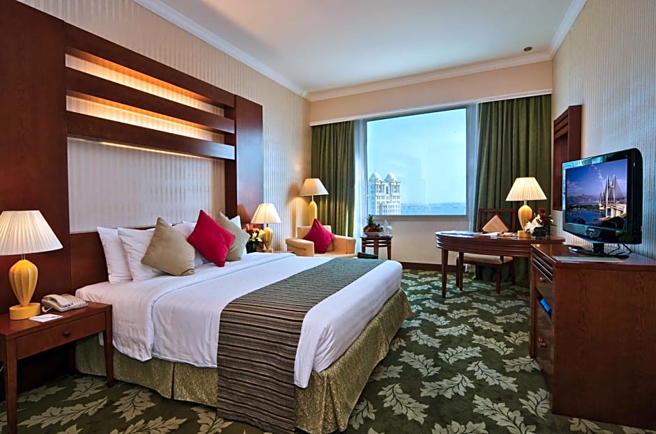 Retaj Al Rayyan hotel offers a variety of room types including Deluxe Twin Rooms with Sea View, Deluxe Double Rooms with Sea View, and Executive Suites with Sea View. All rooms are non-smoking and have an impressive room size of 398 sqft for the twin and double rooms, and 549 sqft for the suite. The twin room and suite accommodate 2 adults, while the double room can accommodate 2 adults and 2 children. The twin room has 2 twin beds, the double room has a queen size bed, and the suite has a king size bed.