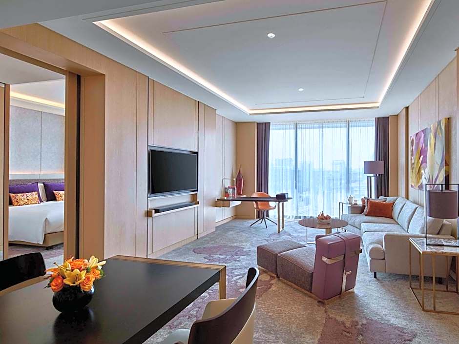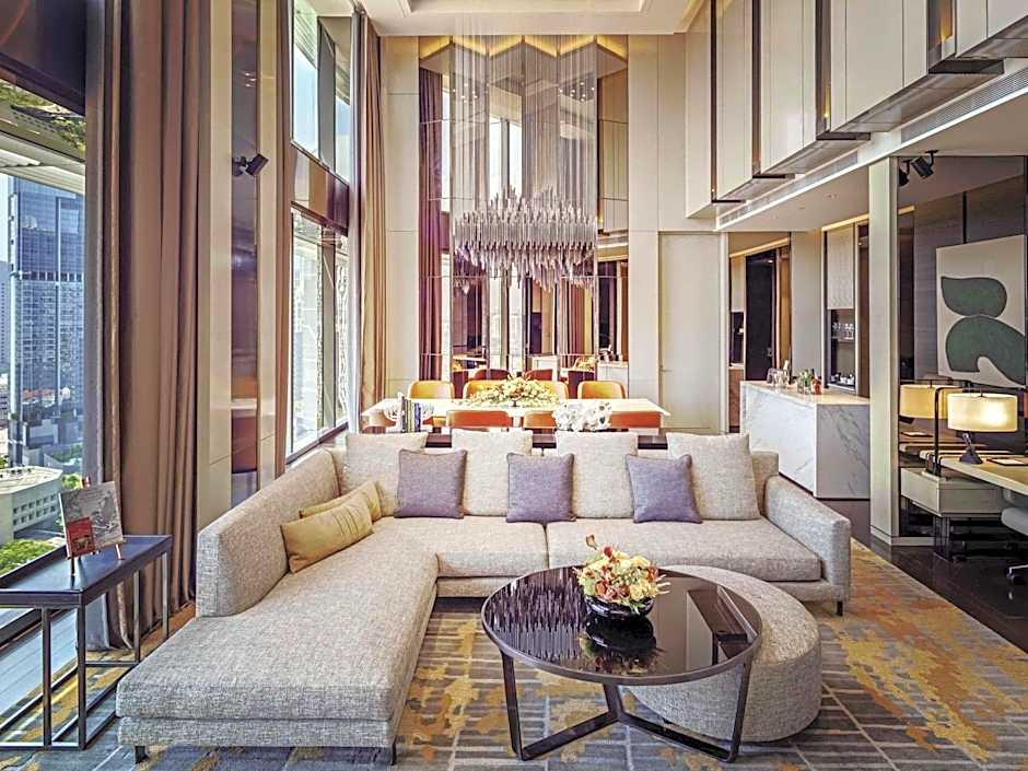 The hotel offers a variety of room types including Luxury Premium Rooms with 1 King or 2 Single beds, Luxury Rooms with 1 King bed, some with city or heritage views, and the Prestige Suite with Club Millésime Access. Most rooms accommodate 2 adults and 2 children, have a size of 409 sqft, and are non-smoking. Suites and Family Rooms are also available, with larger sizes and additional bed options, accommodating 3-4 adults and 2-3 children.