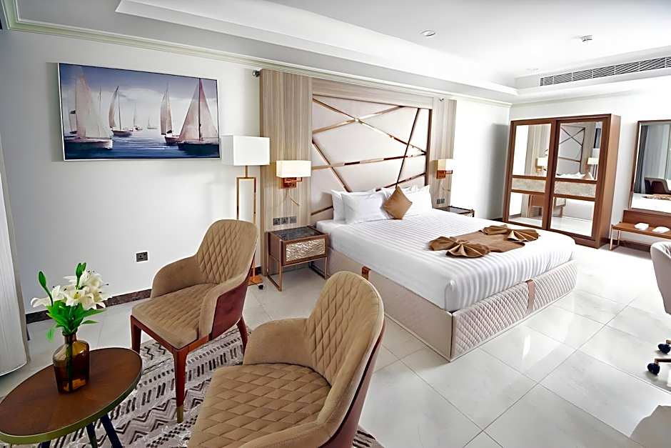 Welcome to Seafront Luxury Suites Jeddah Corniche, where comfort meets elegance by the pristine shores of Saudi Arabia! Located at Prince Faisal Ibn Fahd 23511, this chic 4-star hotel offers a perfect blend of luxury and convenience just 9.1マイル from the bustling city center. Whether you're here for business or leisure, the free Wi-Fi, private parking, and 24-hour front desk ensure a smooth and enjoyable stay, all wrapped up in a stylish setting with incredible landmark and garden views.