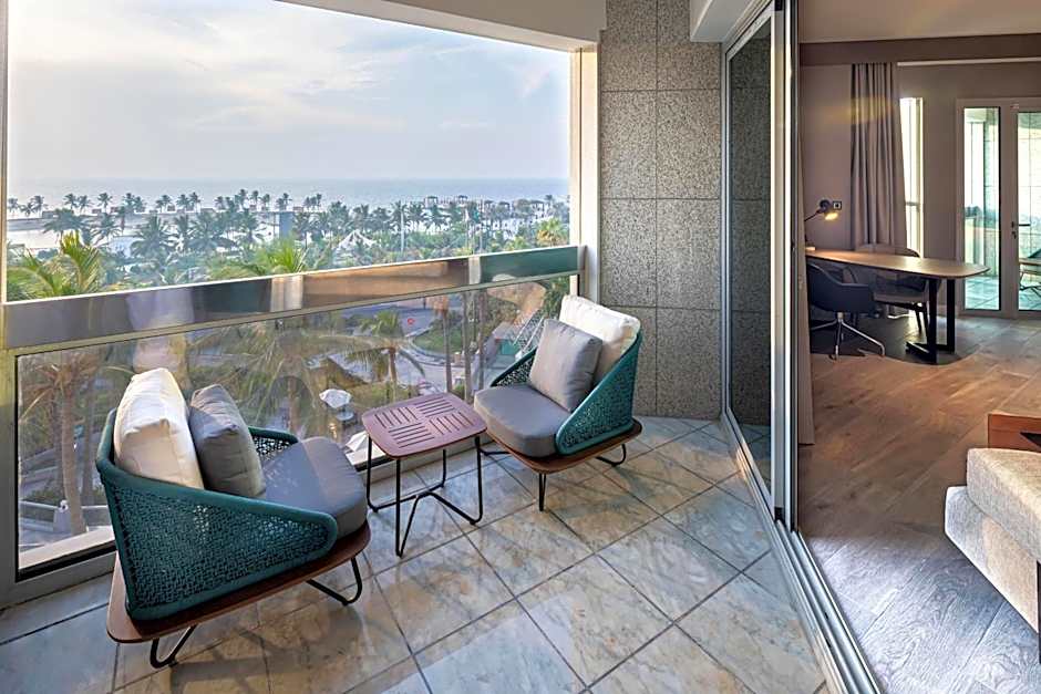 Club Suite, 1 Bedroom, Non Smoking, Sea View (1 Double Bed) is 1098 square feet and includes a double bed 131-150 width plus extra beds on demand, desk, cable tv, hairdryer, tea and coffee making facilities , ironing set, safe, bathrobes, and slippers.