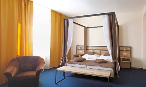 For those seeking a little extra space and luxury, the Deluxe King Suite at Hotel Zobor is the perfect choice. With a room size of 431 square feet, this spacious suite offers ample room for relaxation. The suite is tastefully furnished with a comfortable Queen size bed, ideal for a good night's sleep. Designed to accommodate two adults and one child, the Deluxe King Suite is the ultimate sanctuary for families or couples seeking a little extra comfort during their stay.