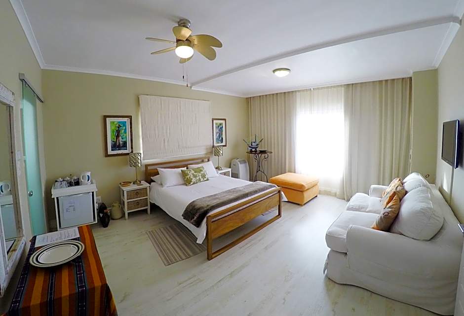 The rooms are stylishly furnished and include a ceiling fan, electric heater and a private bathroom with shower. There is a mini-bar fridge, tea/coffee facilities, a small work desk and also a LED Smart TV. This room has access to the shared lounge and living room on the ground floor with views of the Promenade, Atlantic Ocean and Robben Island.