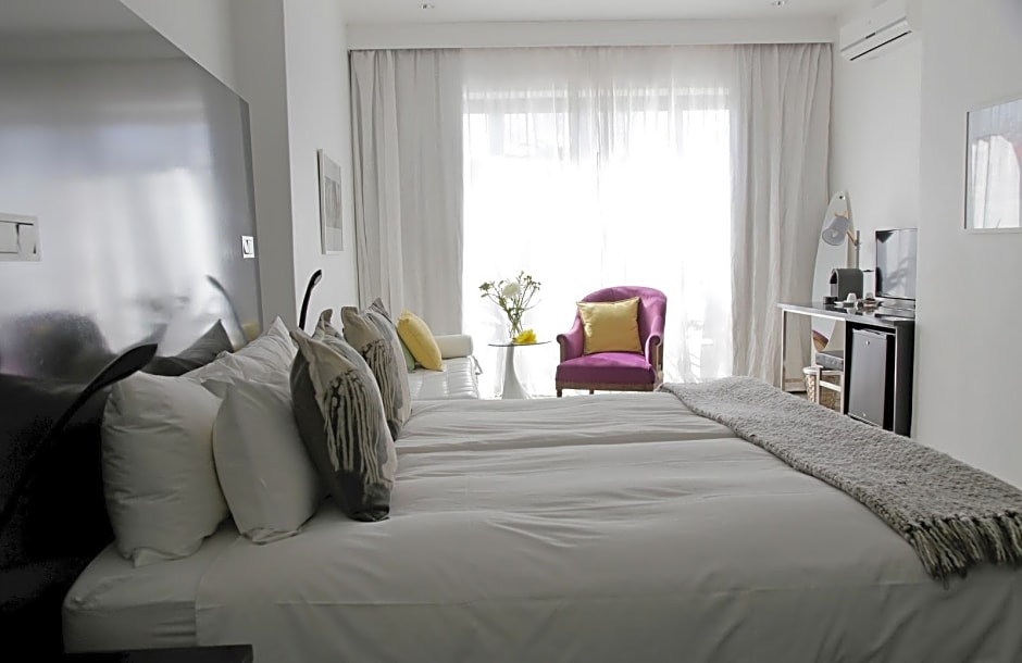 The DysArt Boutique Hotel offers a variety of rooms, including Large Luxury Double or Twin Room, Deluxe Double Room with Patio, and Large Deluxe Seafacing Double Room with Balcony. All rooms can accommodate 2 adults, feature non-smoking policy, and offer different bed configurations such as King or Queen size beds and sofa or twin beds. Room sizes range from 172 sqft to 495 sqft.
