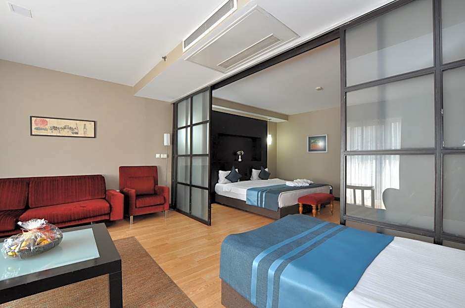 This suite has air conditioning, seating area and mini-bar. Please note that room offers a double bed, sofa and extra bed. There is no capacity for 1 more extra bed in this room type.