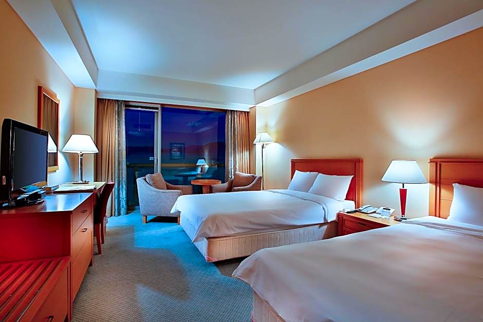 The hotel offers a variety of room types including Deluxe Twin Rooms with Mountain View, Deluxe Double Rooms with Sea View, Deluxe Ondol Rooms with Mountain View, Junior Suite Twin Rooms with Sea View, and Junior Suite Double Rooms with Sea View. These rooms range in size from 377 sqft to 743 sqft. All rooms are non-smoking and have different bed configurations to accommodate up to 3 adults and 2 children or 2 adults and 0 children.
