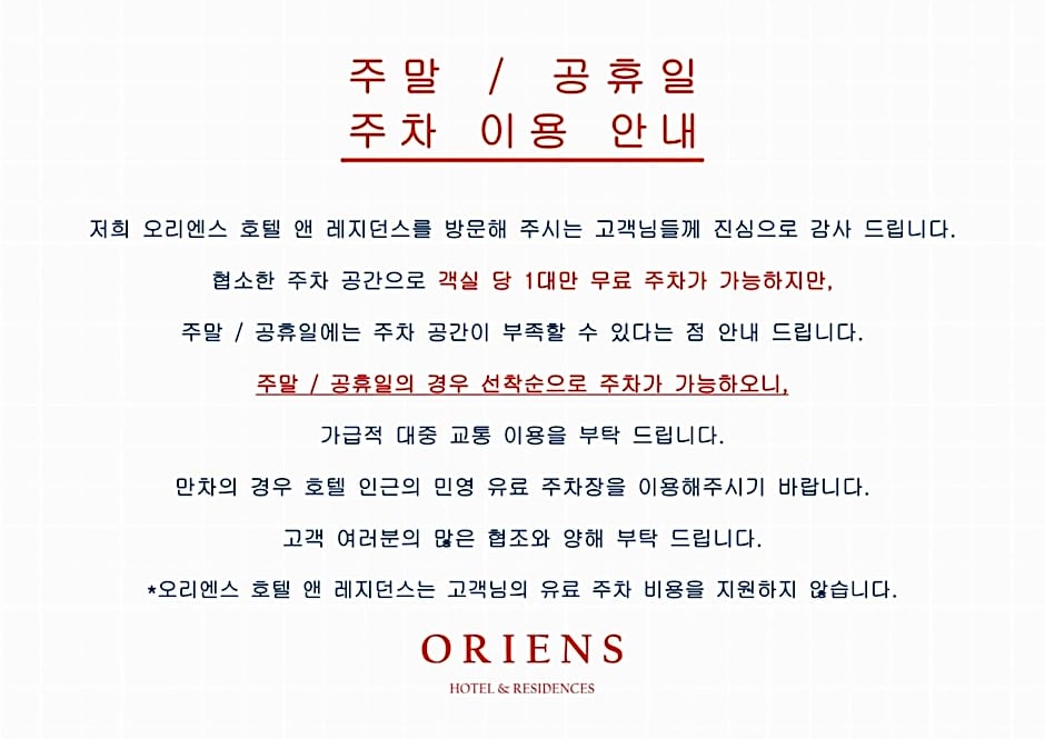 Oriens Hotel & Residences Myeongdong is a 3-star hotel in Seoul, South Korea. Located in Junggu and just about 0,8mi from the city center, it puts travelers near the action of the Myeongdong area while staying comfortably rooted in a convenient district.
