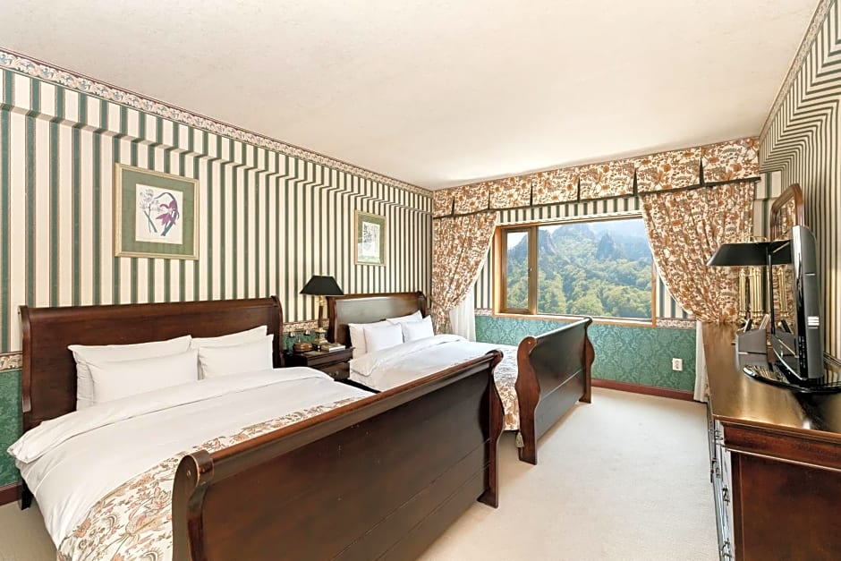 Room types at KensingtonHotel Seorak include Deluxe Family, Executive Family Twin, Deluxe Ondol Double, and Suite rooms. These rooms accommodate 2-3 adults and may have double, twin, or queen-sized beds with some offering futon mats or sofa beds. All rooms have a mountain view, are non-smoking, and range in size from 248 to 646 sqft.