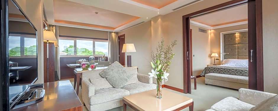 Suite with City view (2ad + 2ch) is 527 square feet and includes either a king-size bed 150-183 width or 2 single beds 80-130 width plus desk, satellite tv , hairdryer, tea and coffee making facilities , safe, bathrobes, and slippers.