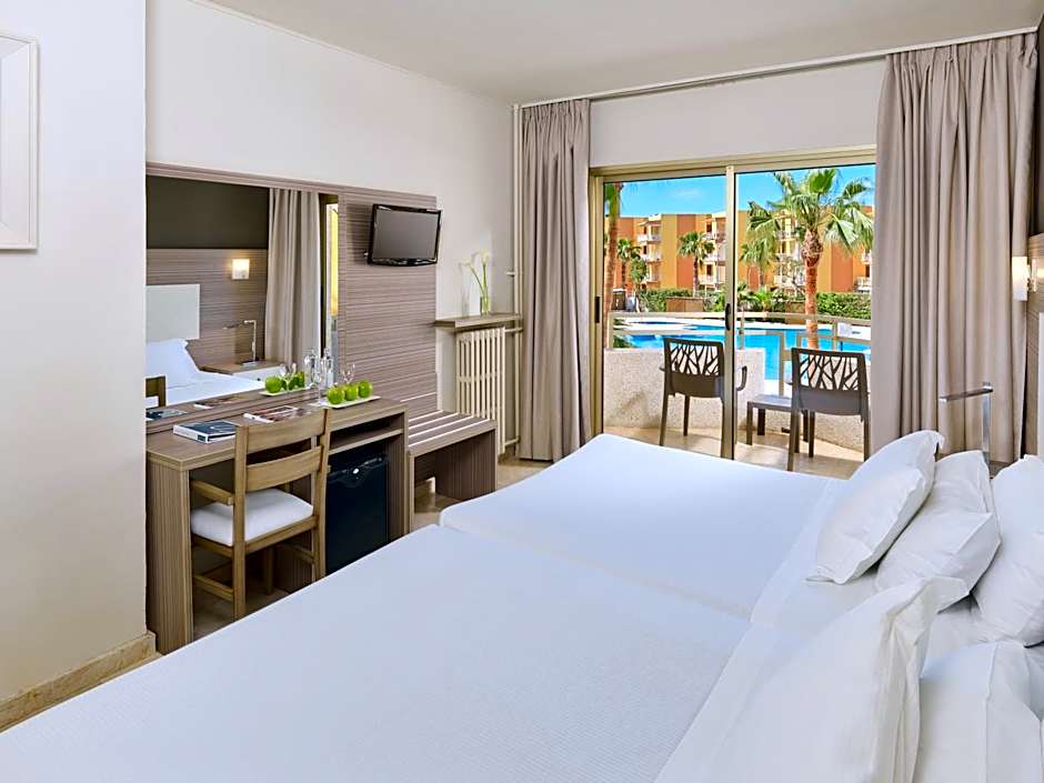 double room with pool view 2 ad + 1 ch is 172 square feet and includes 3 single beds 80-130 width plus safe.