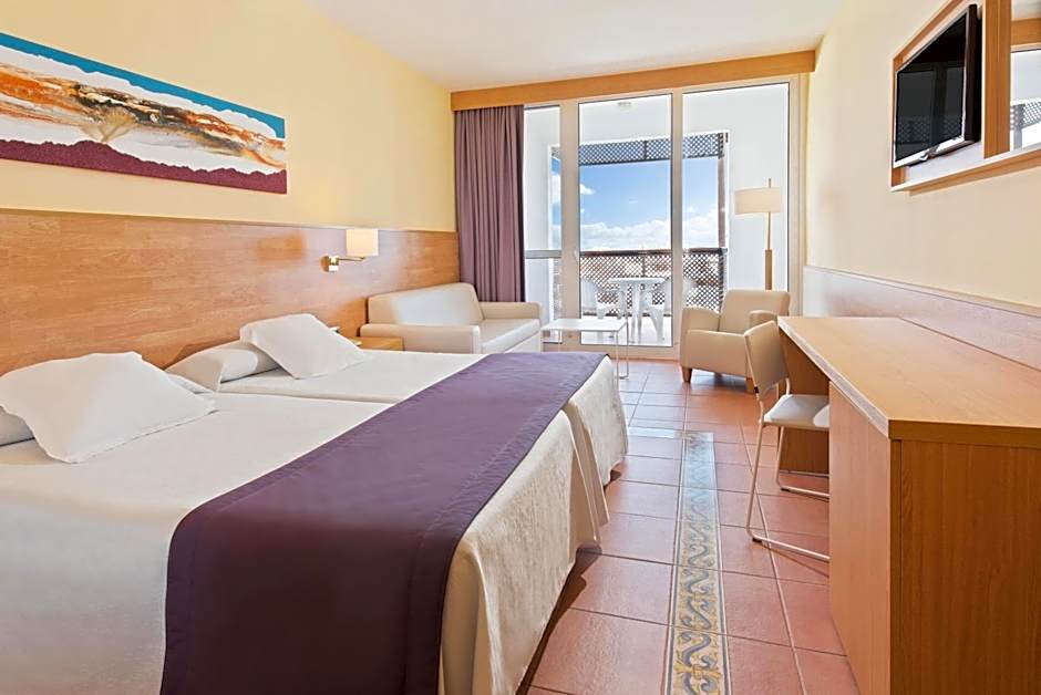 This air-conditioned room is composed by 2 connected bedrooms and a private, furnished terrace. One of the bedrooms features a king size bed and the other has 2 single beds. There are 2 bathrooms with a bath and hairdryer. There is a satellite TV with both national and international channels, and a telephone. There is also an empty mini-bar. Beach towels are provided and a cot is available for free, upon request.