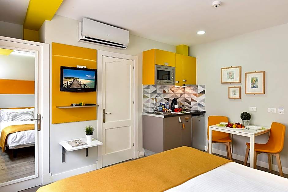 This bright and welcoming studio features light-colored décor and wooden furnishings. It includes free WiFi, air conditioning, a flat-screen satellite TV, and a fully equipped kitchenette with a fridge, microwave, coffee maker, and essential kitchenware. The studio offers one double bed or two single beds, and a private bathroom with shower. Please note that this studio does not have a balcony. Ideal for travelers seeking comfort, independence and excellent value near Las Canteras Beach.