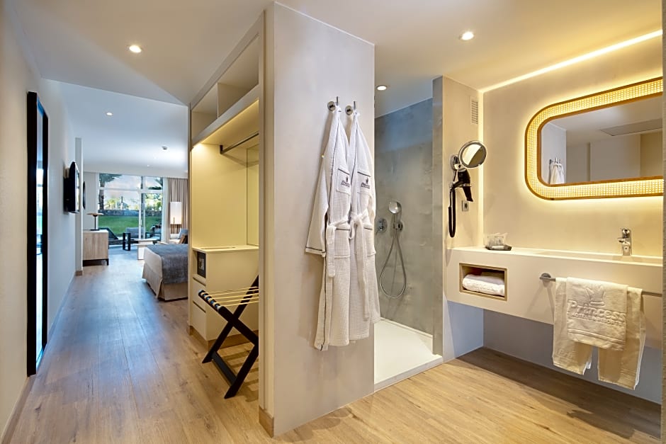 SUITE PRESTIGE 2 ADULTS is 700 square feet and includes 2 single beds 80-130 width plus living room, balcony, satellite tv , hairdryer, safe, bathrobes, and slippers.