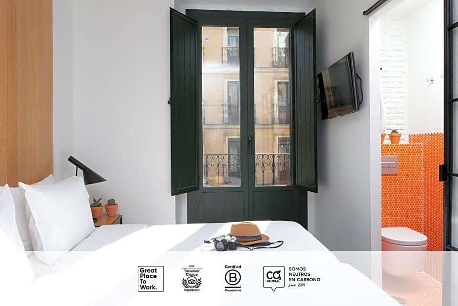 Double room with balcony: Exterior double room, ideal for travellers who need a bit more space and who want to enjoy a pleasant view of one of the city’s most iconic streets. If you are travelling with a lot of luggage for a few days or you simply like waking up and enjoying the sun first thing in the morning, this is the best room for you. Type of bed not guaranteed. . Viscoelastic matress (2 beds of 90cm or doublebed of 150/160cm, subject to availability), 4 pillows, plus a pillow menú, nordic quilt, free highspeed WiFi, bluetooth speakers and rain effect shower with high pressure.
