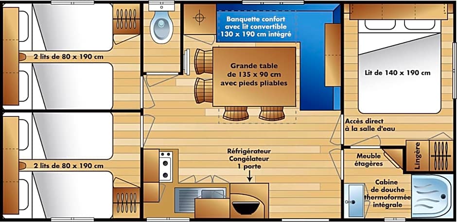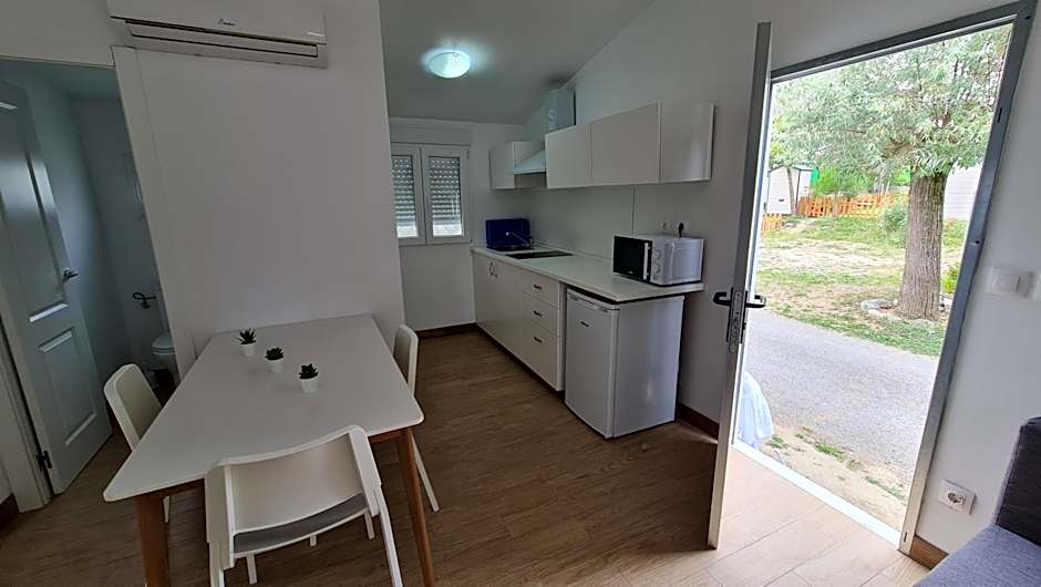 This mobile home's special feature is the pool with a view. Featuring a private entrance, this mobile home also consists of 1 living room, 3 separate bedrooms and 1 bathroom with a shower. The fully equipped kitchen features a stovetop, a refrigerator, kitchenware and a microwave. A seating area with a flat-screen TV, a tea and coffee maker and an outdoor dining area are provided in this mobile home. The unit offers 6 beds.
