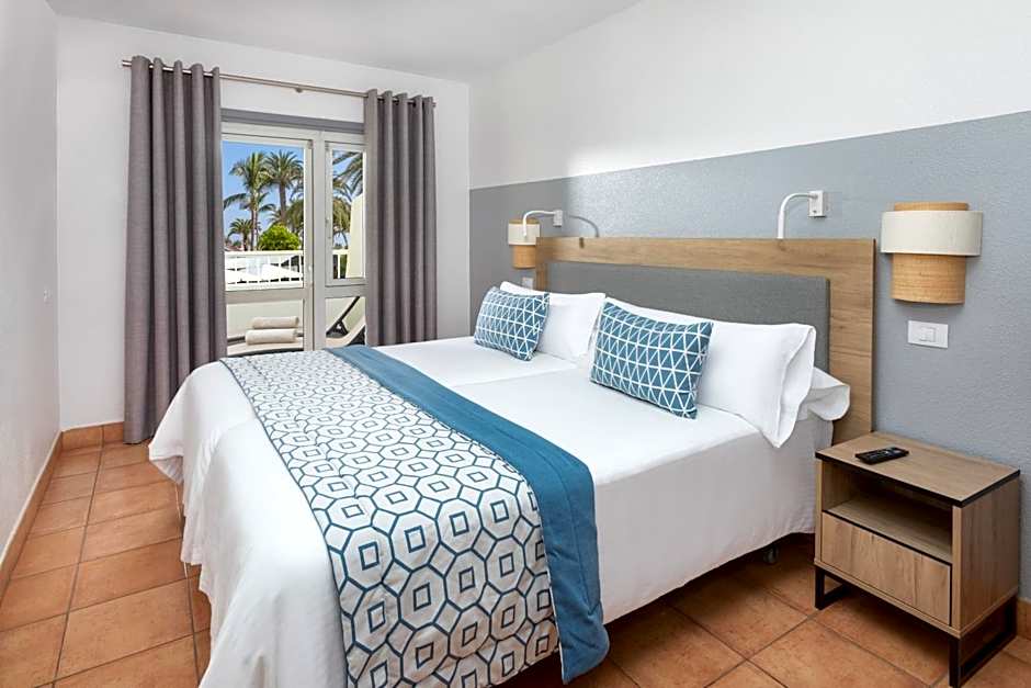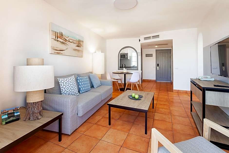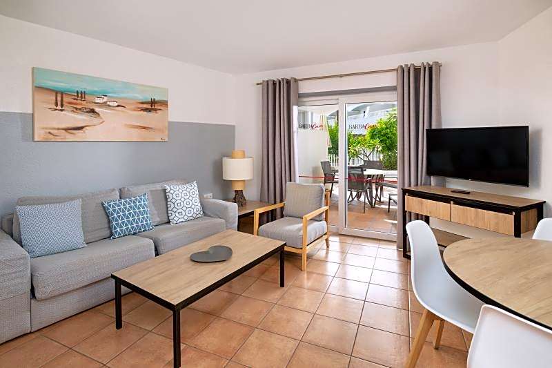 This air-conditioned apartment has a large terrace with a lounge set, automatic sun screen, sun loungers and views of the pool and garden. It includes a twin bedroom with TV, a bathroom with a hairdryer and toiletries and a lounge with a TV. The kitchen comes with a ceramic hob, microwave and fridge. A range of extra facilities includes: wine and fruit on arrival, free safe, complimentary mini-bar on arrival, coffee machine with free capsules, one a-la-càrte dinner including house wine for stays of minimum 7 nights, electric kettle with infusions, pool towels in the room, complimentary slippers and beach bag, bathrobes and special bathroom amenities.