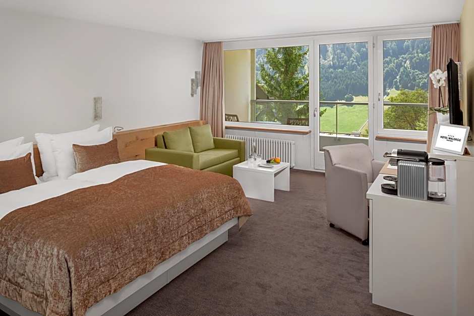The Hotel Waldegg offers Deluxe Double Rooms with balconies and mountain views. These rooms can accommodate 2 adults and are non-smoking. The room size is 441 sqft and features a King size bed.