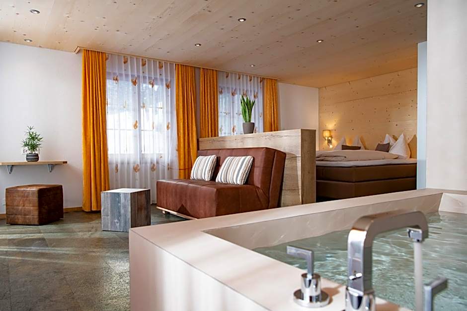 The double room is located in the chalet behind the hotel and has a mountain view. The room provides a balcony, a safe deposit box, heating, and a private bathroom featuring a shower and a big bathtub for two in the room. This double room features a flat-screen TV with cable channels. The room offers one double bed and a sofa bed for up to two extra people can be booked.