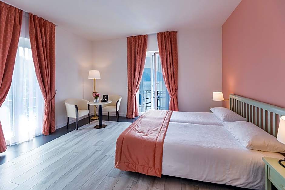 Spacious, air-conditioned room with a balcony overlooking Lake Lugano, a flat-screen cable TV, a seating area, a mini-bar, and a bathroom with a bath.