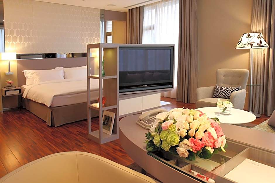 Featuring a large floor-to-ceiling window with garden view, this spacious suite is located on the 11th floor, sectioned by a living room with sofa and working desk, and a large bedroom with a king-size bed. The private bathroom has a bathtub, walk-in shower, free toiletries and hairdryer. Guests can use the private entrance to enjoy the high privacy of the stay.