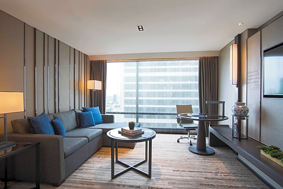 This suite features a executive lounge access, flat-screen TV and soundproofing. In-room benefits include: - Complimentary local landline calls within Bangkok (excluding mobile numbers) - Complimentary pressing service – two items per day per room (excluding laundry and express service) -Complimentary coffee, teas, snacks and nonalcoholic drinks throughout the day -Daily buffet breakfast and M Club benefits included
