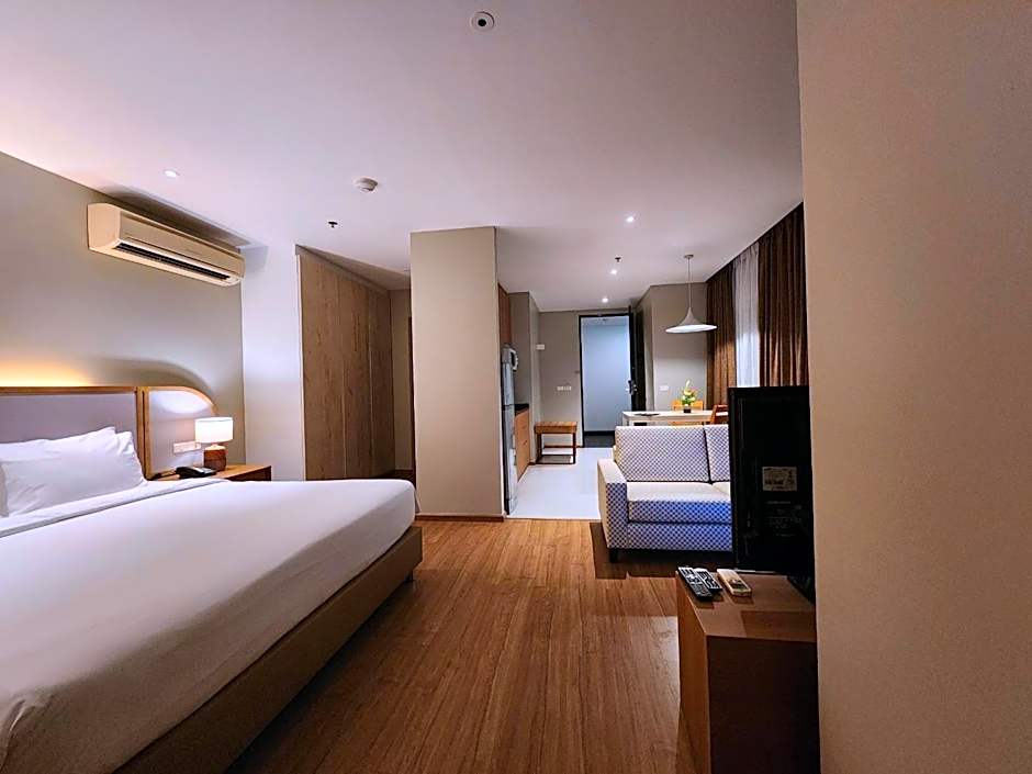 Junior Suite (King size bed & 1 Living Room) is 560 square feet and includes a king-size bed 150-183 width plus living room and extra beds on demand.