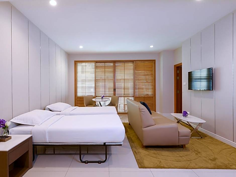 This Thai modern-style suite comes with a large living room with 2 extra beds, a sofa and a 2-seat dining table. It also has a bathroom with a separate shower and bathtub. Please note that the bedroom comes with a King-size or twin beds and is subject to availability upon check-in. Please note that this room type has no capacity to accommodate extra beds.