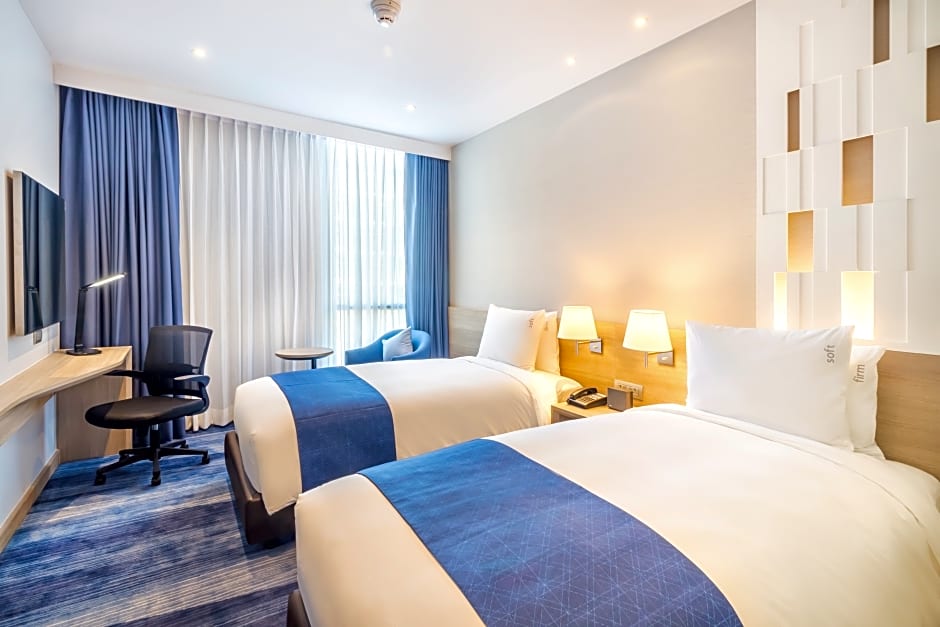 The Holiday Inn Express Bangkok Soi Soonvijai offers a variety of room options including Standard Twin, Standard Double, Standard Queen, and Queen Room - Accessible. The rooms range in size at 226 sqft and can accommodate 2 adults and 1 child. Smoking is not allowed in any of the rooms. Bed sizes vary from 2 twin beds in the Standard Twin room to a queen size bed in the Standard Double and Standard Queen rooms.