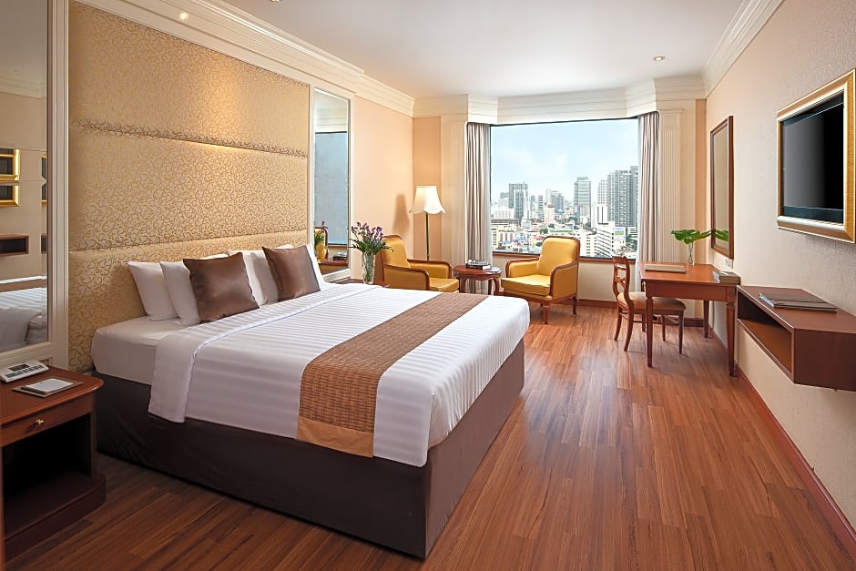 The Emerald Hotel offers Superior Double or Twin Rooms and Deluxe Double or Twin Rooms, both with twin beds and a queen size bed. These rooms are non-smoking and accommodate 2 adults and 1 child. Additionally, the hotel has an Executive Suite with a king size bed, also non-smoking, and accommodating 2 adults and 1 child. Room sizes range from 355 sqft to 969 sqft.