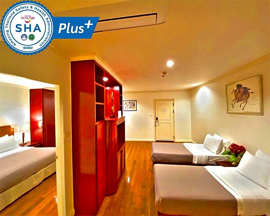 TRIPLE ROOM is 409 square feet and includes either a king-size bed 150-183 width or a single bed 80-130 width plus satellite tv and safe.