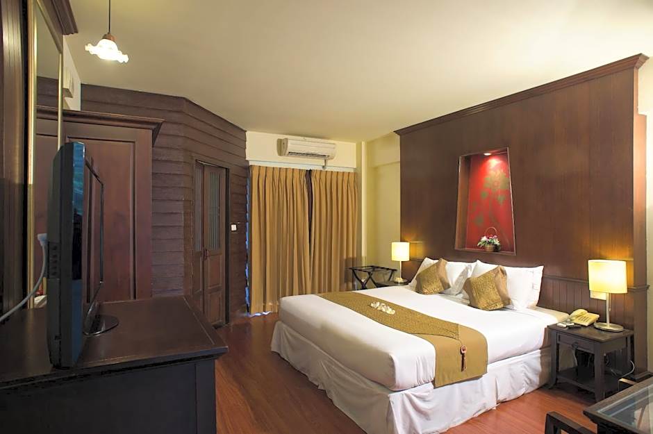 Deluxe Lanna is 323 square feet and includes either a king-size bed 150-183 width or 2 single beds 80-130 width plus balcony, cable tv, hairdryer, and safe.