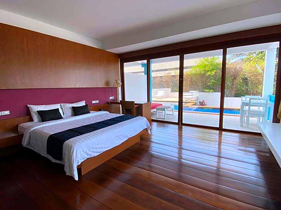 Room options range from Deluxe rooms with a king bed and partial sea views or a balcony to spacious two-bedroom villas that can sleep up to four guests. The two-bedroom Villa options include a private pool or a pool-view configuration, with suites such as the Deluxe Suite, Sea View, and the Family Suite providing extra space. A Family room is also listed among the choices. Cash is the only accepted payment.