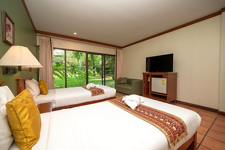 Rooms at Comsaed River Kwai Resort SHA include Garden View and River View Deluxe Twin Rooms, Deluxe Villas, River View Deluxe Triple Rooms, River View Deluxe Family Rooms, and River View Suite Rooms. Smoking is not allowed in any of the rooms. The rooms accommodate 3 adults and 1 child and feature various bed sizes including Twin, Double, Queen, and King beds. Room sizes range from 344 sqft to 775 sqft.