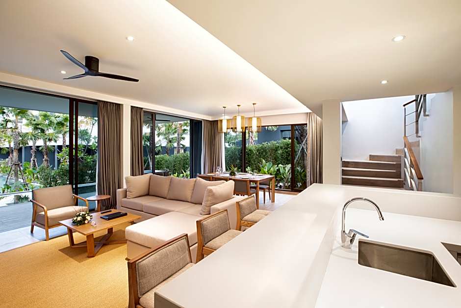 Three Bedrooms Private Pool Villa with Main Pool Access is 2691 square feet and includes either a king-size bed 150-183 width or 2 single beds 80-130 width plus living room, balcony, terrace, satellite tv , ironing set, bathrobes, and slippers.