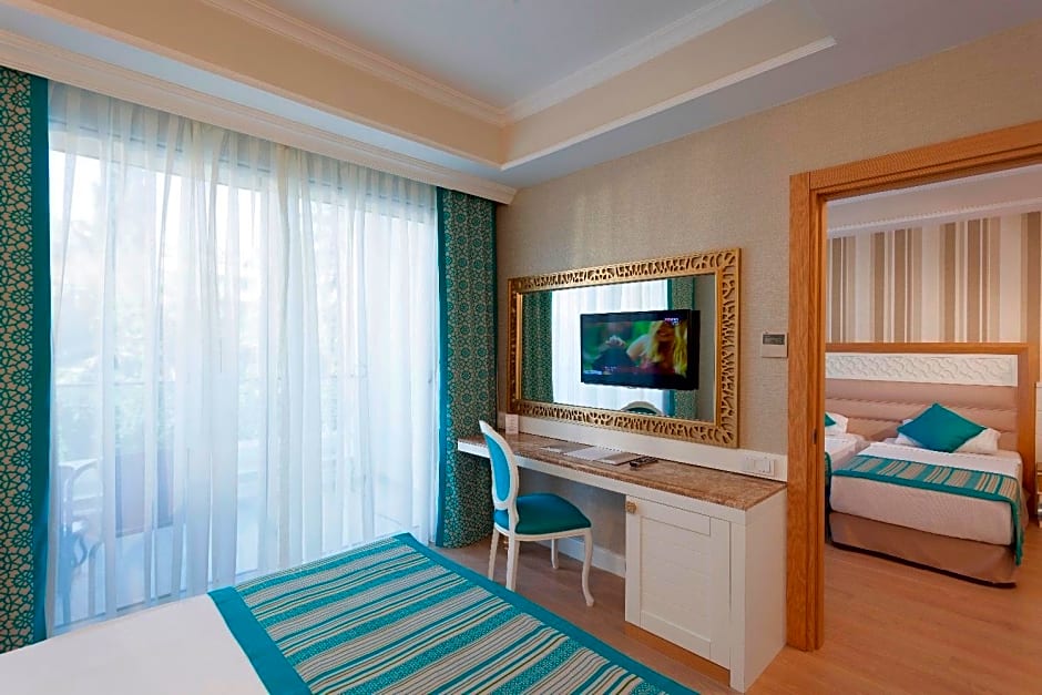 The Karmir Resort & Spa - Ultra All Inclusive boasts an array of fantastic amenities including a free water park, private beach area, indoor and outdoor swimming pools, a kids' pool, and even a tennis court - all available at no extra cost. You can unwind in the Turkish/Steam Bath or sauna, or treat yourself to a spa experience for an additional charge. The hotel offers non-smoking rooms with air conditioning, along with free private parking on site.