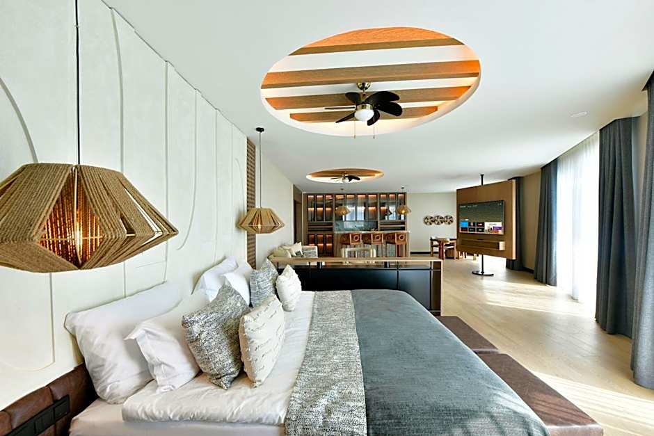 On-site highlights include a free water park and a free kids’ club, plus a private beach area, multiple pools (indoor and outdoor) and a dedicated kids’ pool. A spa with Turkish bath, sauna and steam room is free, while modern touches like free Wi‑Fi, air conditioning, a terrace, a balcony with views, and soundproof rooms keep comfort high. Free on-site parking, a fitness center, restaurant, bar, and live music performances round out evenings by the shore.
