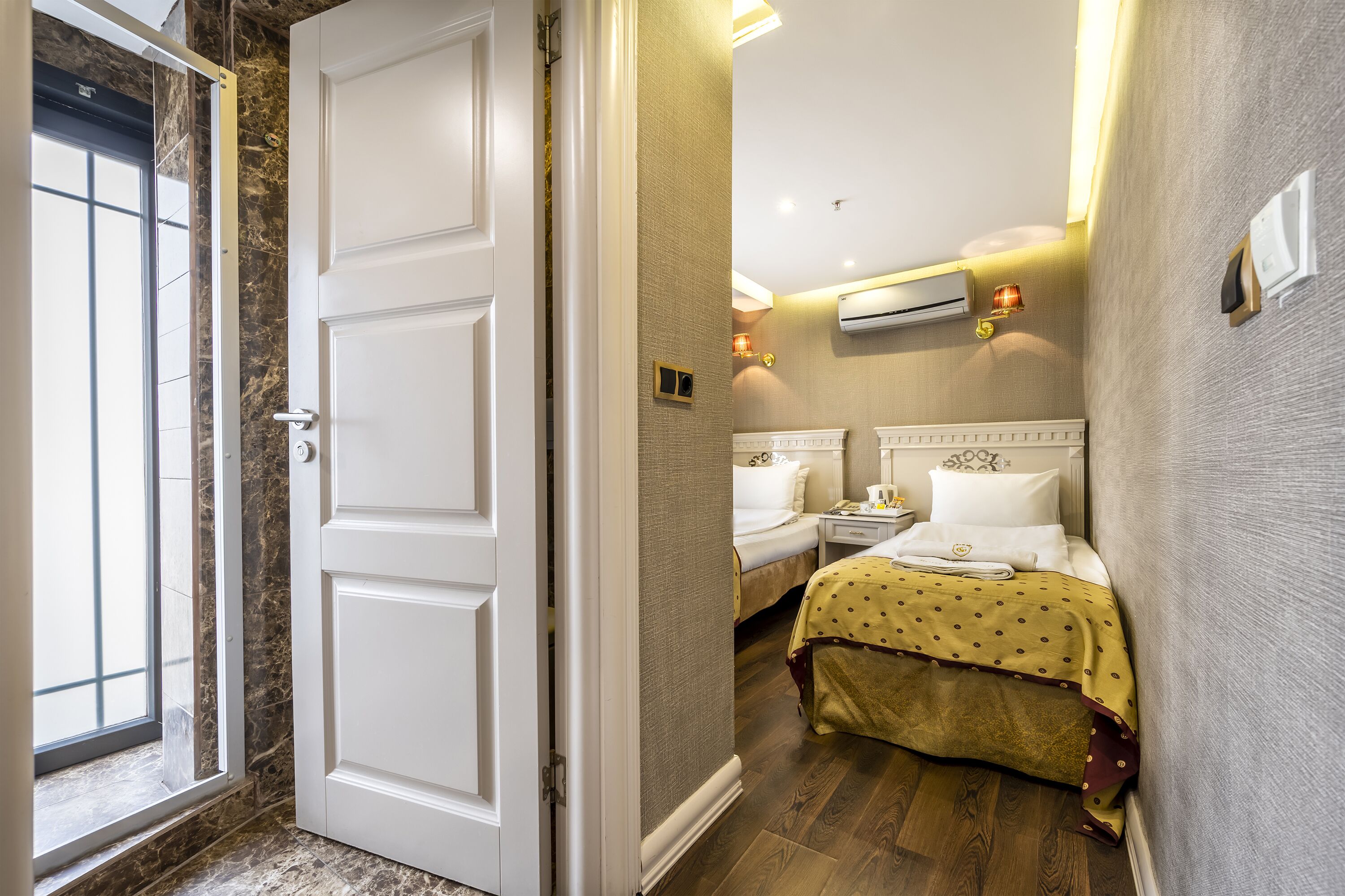This twin room has a soundproofing and air conditioning.