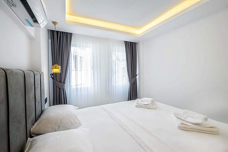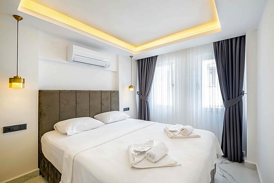 Room options at Yosun Apart come in a range of styles: Studio, Loft, Economy, Apartment with Sea View, Apartment with Garden View, Apartment, 1 Bedroom, and Suite, Jetted Tub. Each option accommodates 2 adults and 1 child and is non-smoking. Sea View and Garden View apartments offer different outlooks, while the Suite features a Jetted Tub.
