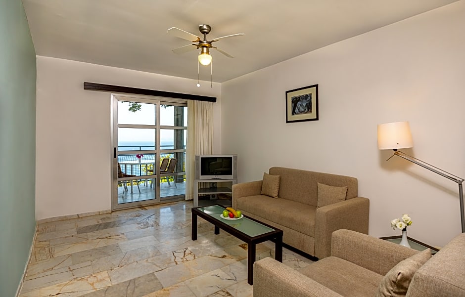 SUITE TWO BEDROOMS SEA VIEW) is 517 square feet and includes either a double bed 131-150 width or 2 single beds 80-130 width plus balcony, terrace, satellite tv , hairdryer, ironing set, and safe and is Wheelchair-accessible.