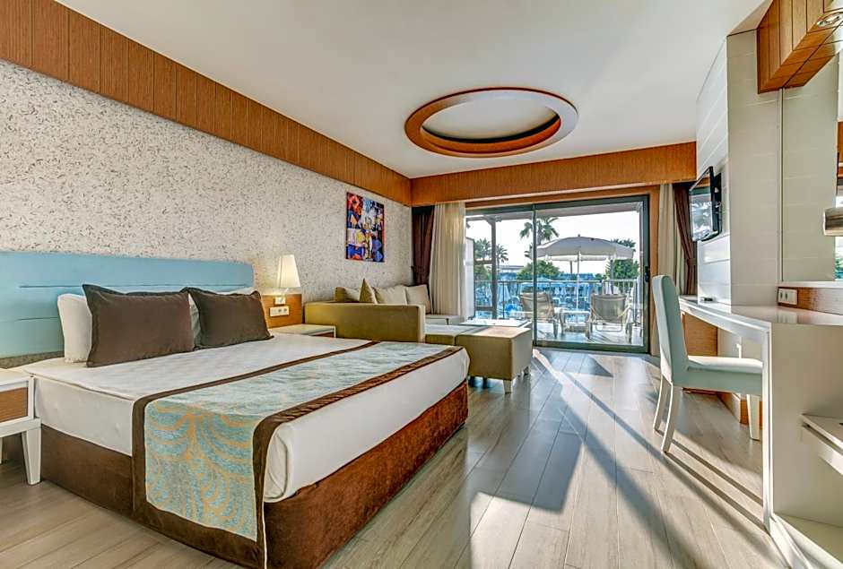 Meeting and banquet facilities are available for a fee, while shuttle services and water sports facilities on site can be arranged for an extra charge. A range of room options—Standard Room, Family, 2 Bedroom, Sea View and Room With Pool View, plus Villas and Apartments—caters to different group sizes. The property sits amid a garden setting with a playground and balconies or terraces offering garden views, completing a welcoming scene after days of sun and sea.