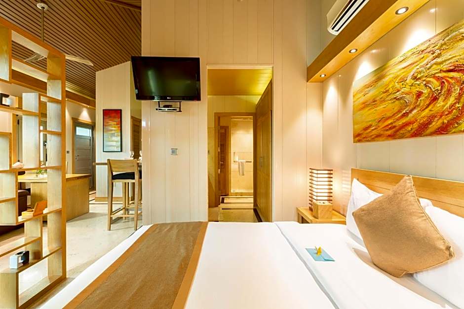 This deluxe ground-floor suite has a private entrance and a covered terrace with a BBQ upon request, overlooking the tropical organic gardens. Featuring high ceilings, marble floors and elegant contemporary décor, it offers a queen bedroom with pure cotton bed linen, a stylish bathroom and a spacious living-dining area with flat-screen TV. The fully equipped stainless steel kitchen includes an oven, microwave, coffee maker and fridge-freezer.
