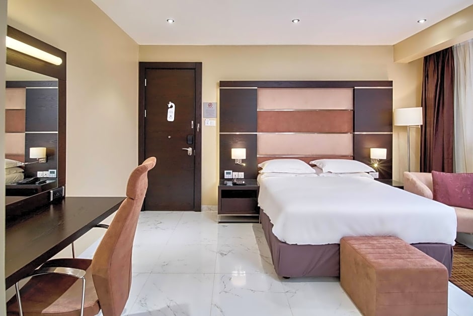 The hotel offers Standard Queen Rooms for single occupancy, with a room size of 161 sqft and a Queen size bed. Smoking is not allowed in these rooms, and they can accommodate 2 adults and 1 child. The Club level Guest rooms also have a Queen size bed, a city view, and a balcony, with the same occupancy capacity and no smoking allowed. Additionally, the hotel provides Deluxe King Suites, with a King size bed, a sofa bed, and a room size of 140 sqft, accommodating 2 adults and 1 child, and no smoking is allowed in these suites.