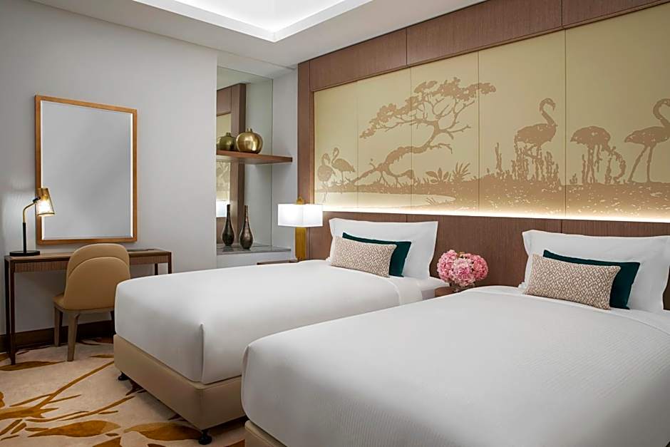 The Al Jaddaf Rotana Suite Hotel offers Family Interconnecting Rooms with city views, accommodating 4 adults and 3 children, featuring both twin and king-sized beds. The hotel also has various suites, including one and two-bedroom options with pool or city views, accommodating 2 adults and 1 child, and larger suites accommodating up to 6 adults and 4 children. Smoking is not allowed in any of the rooms. Room sizes range from 646 sqft to 2476 sqft.
