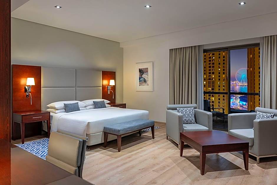 This double room features a king bed, a sitting area, floor to ceiling windows with partial sea views on JBR and Ain Dubai. The room also offers air conditioning, free bottled water, and free Wi-Fi.