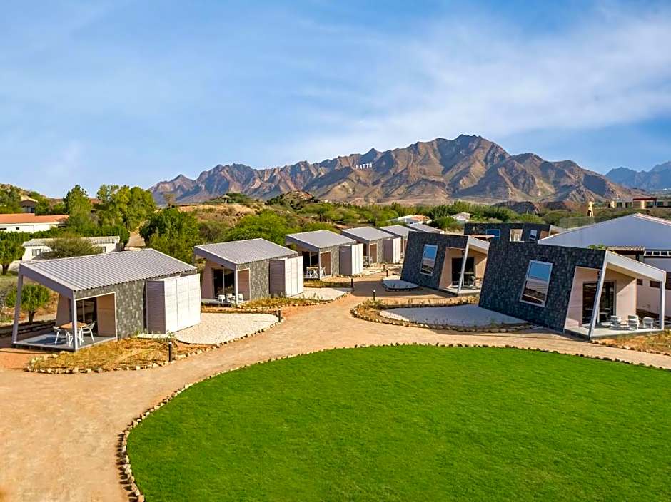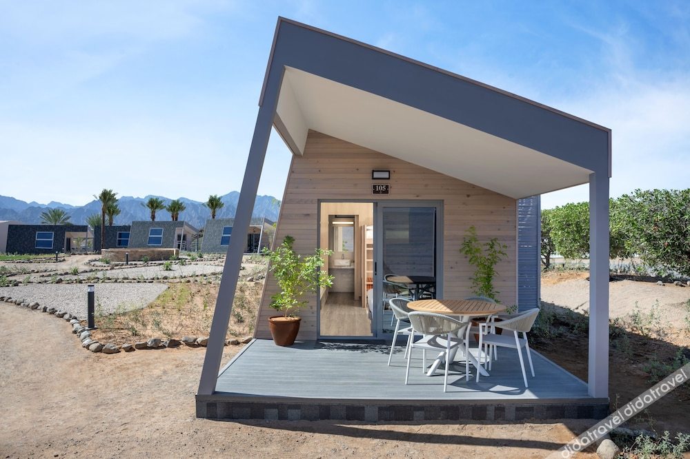 Terra Cabin Deluxe is 388 square feet and includes a queen-size bed 150-154 width.