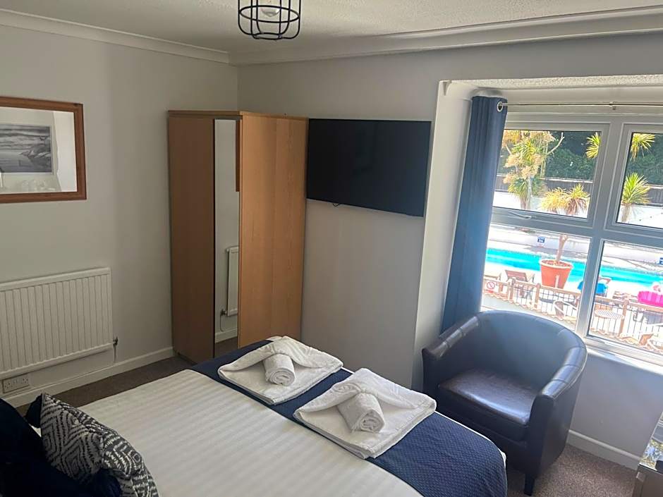 Located on the second floor and overlooking the pool at the rear of the property, this small double room has private bathrooms. This room will not have a sea view.