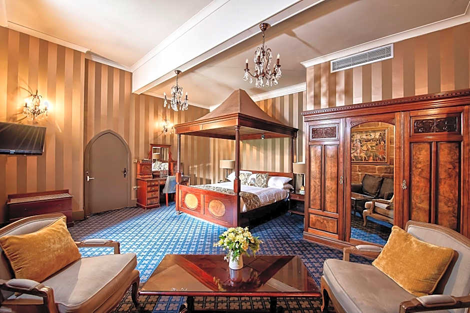 This room with attached bathroom has a king-size four-poster bed and a window seat. It also features a private sauna and a semi-sunken bath.