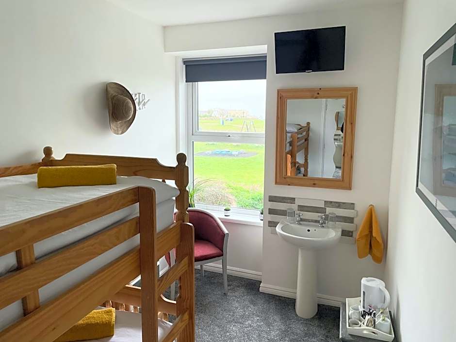A room with a bunk bed sleeping 2 people. Has its own sink and sea views.