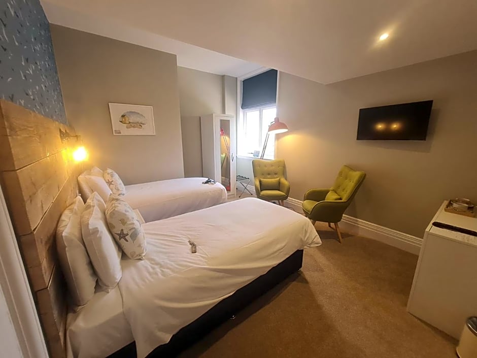 This double room has a tea/coffee making facilities. The room features a fresh coastal decor theme and includes an private bathroom with walk in shower This room has a balcony door which doubles up as an emergency fire exit door.