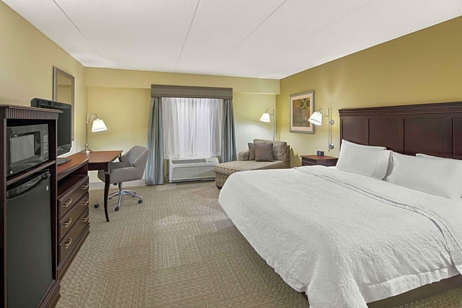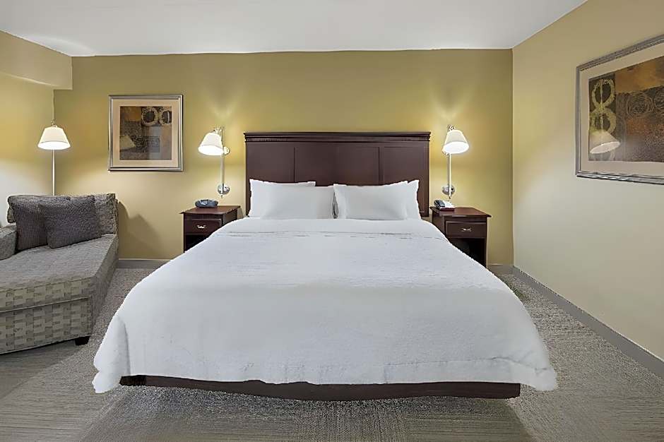 32-inch LCD TV, sofa bed, work desk, microwave, refrigerator, coffeemaker, free WiFi access Enjoy a restful stay in this spacious studio suite with a king-sized clean and fresh Hampton bed®, a sofa bed and a 32-inch TV with HD channels. Additional amenities include a large work desk, a microwave, mini-refrigerator and a coffeemaker. Free WiFi access will help you to stay connected when on the road. The bathroom contains plush towels and a shower featuring a curved shower rod for added space and light.