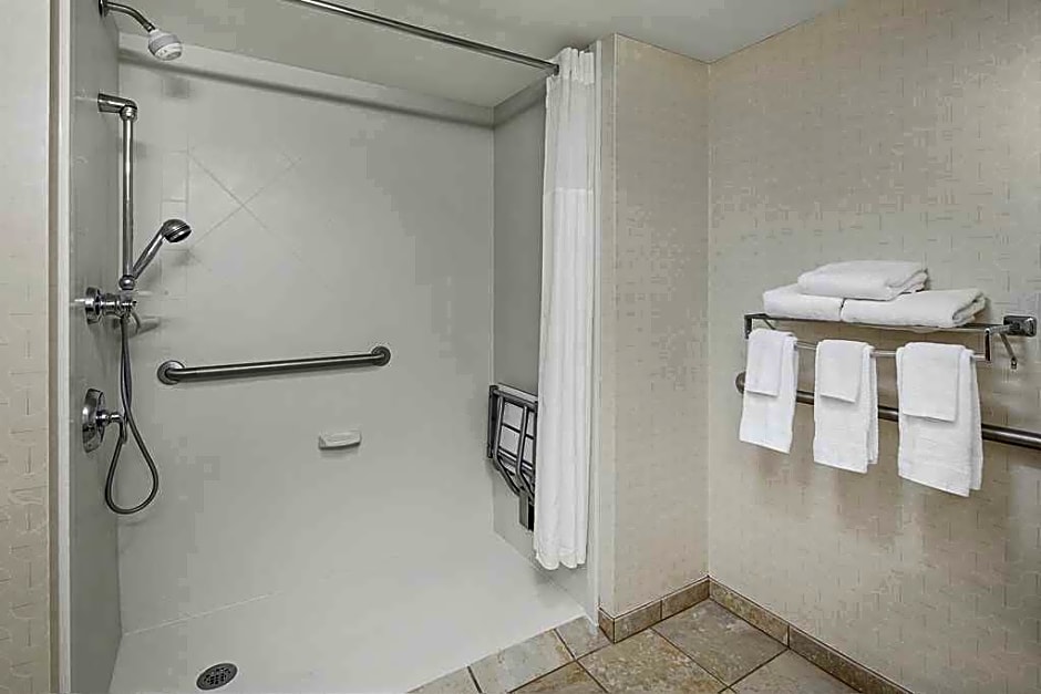 This mobility and hearing accessible, non-smoking room features one king-sized bed, and an accessible roll-in shower. The room also has a visual alarm and notification devices for the doorbell or door knock and incoming phone calls available at checkin. The room features comfortable soft seating, microwave, refrigerator, a HDTV, and easy to operate alarm clock/radio. The free WiFi access will help you stay connected while on the road. If you prefer not to work at the desk, you can use the convenient lapdesk instead. You'll also enjoy the convenience of having a coffeemaker with tea service and iron/ironing board in your room. Any corresponding photo may not reflect the specific accessible room type or room feature.